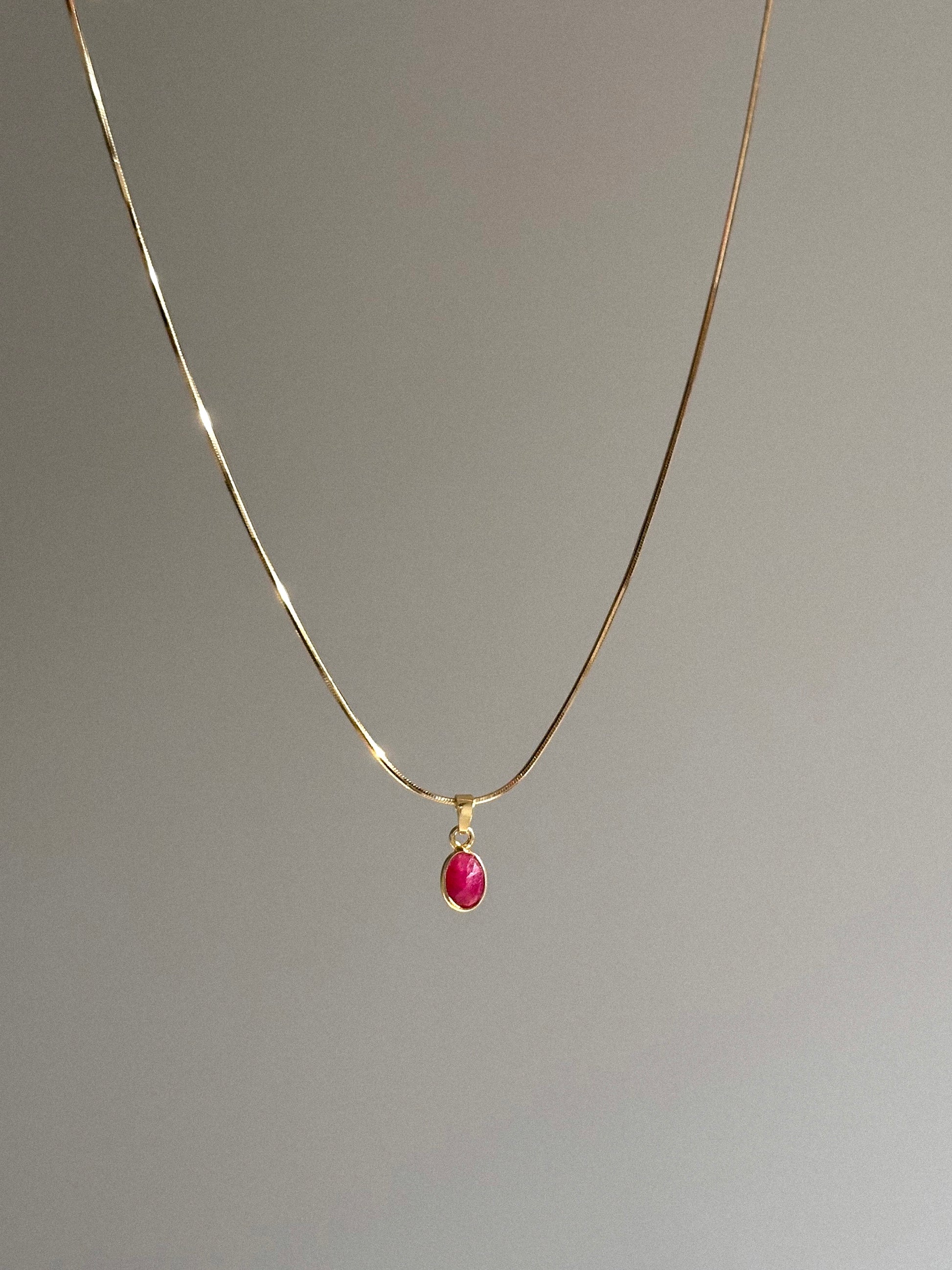 Naszyjnik Rubis wykonany został z łańcuszka ze srebra próby 925 pokrytego dwoma warstwami 18k złota oraz z zawieszki z rubinem.