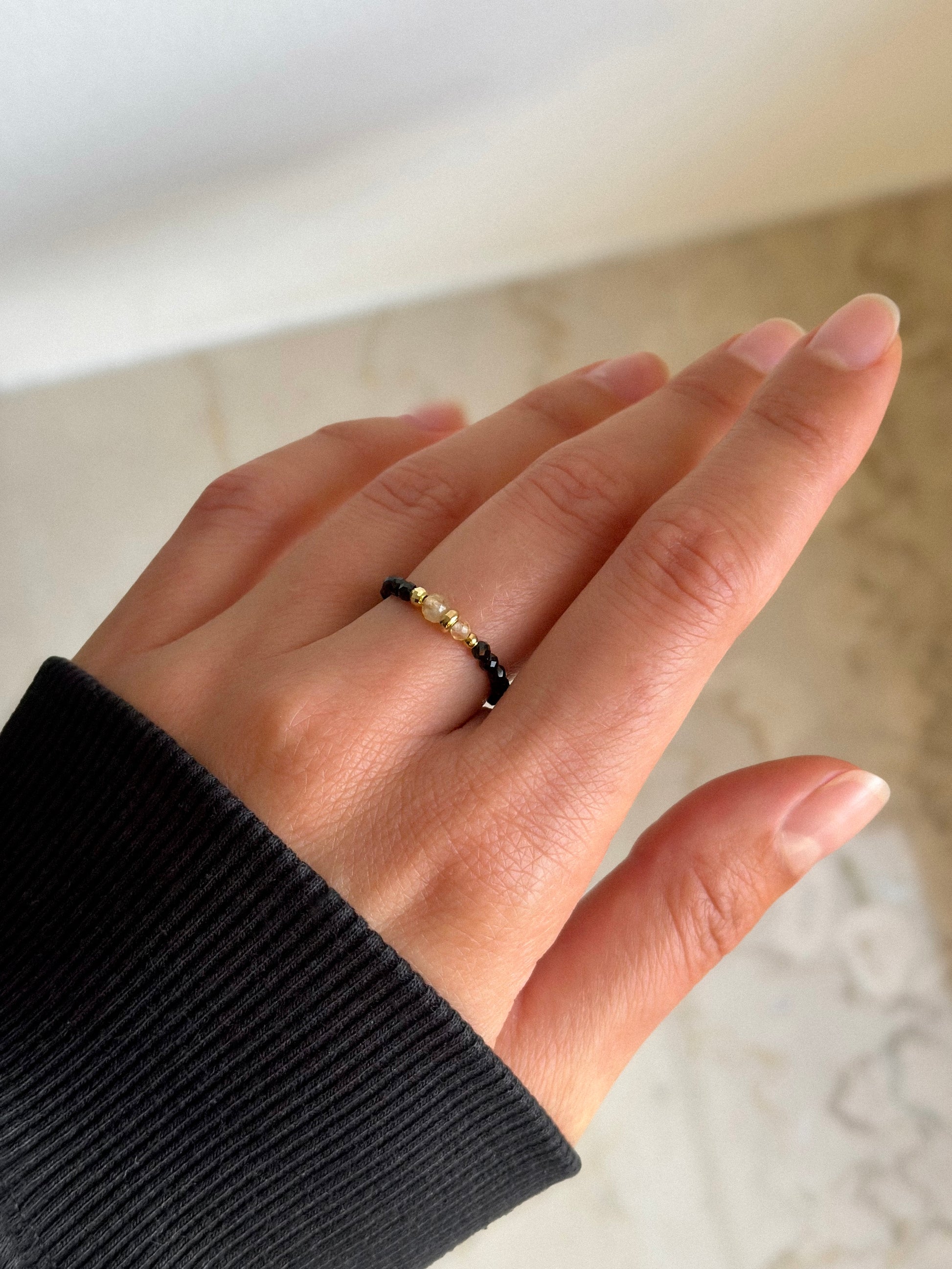 Pierścionek Sucre wykonany został z naturalnych kamieni oraz pozłacanych koralików.